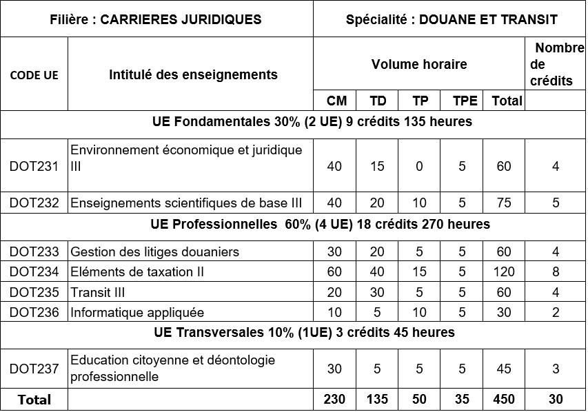 Cette spécialité a pour objectif de former des techniciens supérieurs capables d’accompagner les opérateurs du commerce extérieur dans la préparation et l’accomplissement des opérations d’importation et d’exportation. Ils pourront également accomplir les formalités de dédouanement des marchandises et obtenir auprès de l’Administration des Douanes, pour le compte des opérateurs économiques, des avantages et des privilèges prévus par la législation et la réglementation douanière